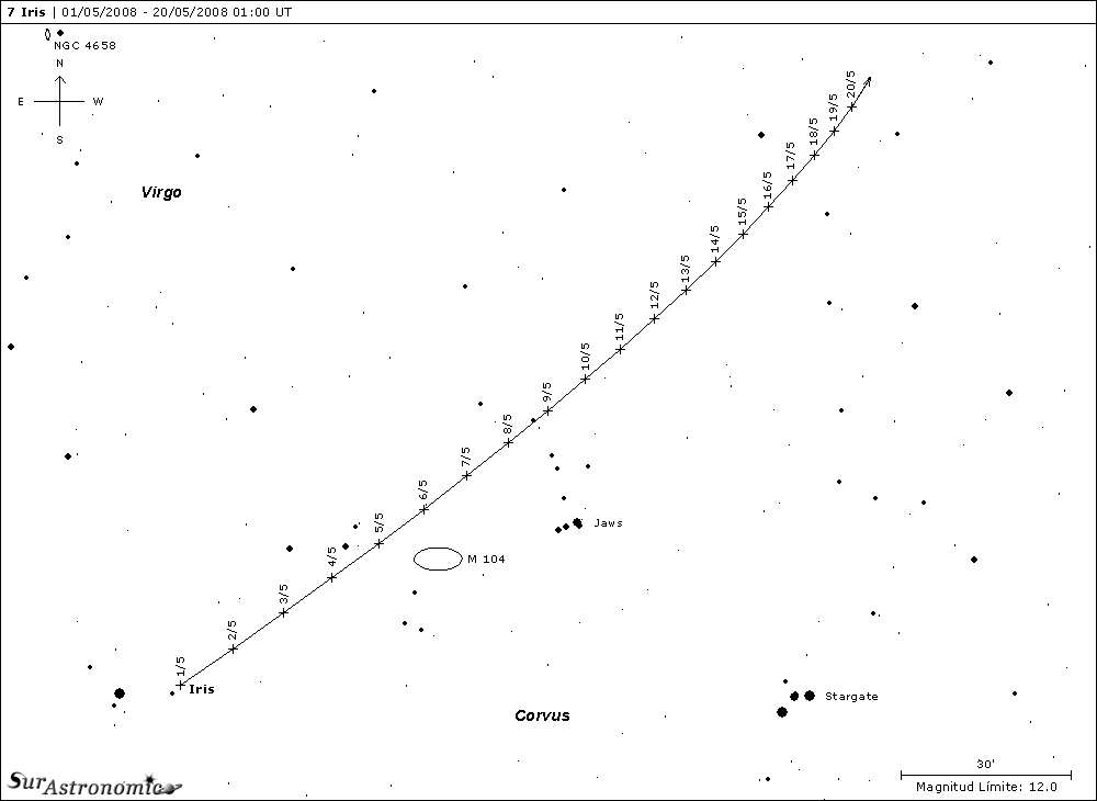 En esta oportunidad Iris cruzará el campo visual cercano a la Galaxia del Sombrero (M 104), pasando a 10' del centro de la galaxia el 5 de Mayo de 2008, con magnitud +10.0, formando un triángulo con dos estrellas al Este, una de brillo algo superior (HD 110283, +9.1) y la otra de brillo algo inferior (TYC 5531-545-1, +10.3), con el asteroide ubicado en el vértice que apunta a la galaxia. El distintivo asterismo Jaws podrá observarse al Oeste del conjunto.