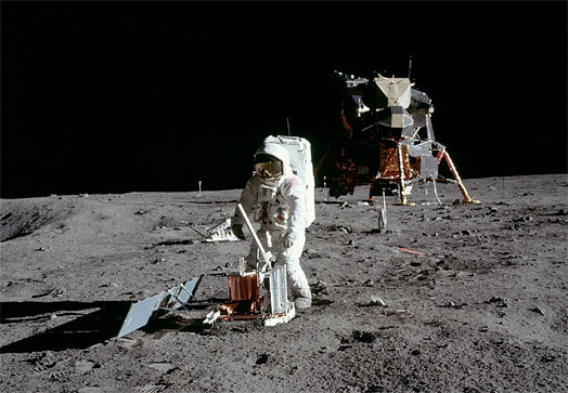 El 16 de Julio de 1969 la misión Apollo XI partió con destino a la Luna impulsada por un cohete Saturno V, despegando de la plataforma LC 39A de Cabo Kennedy a las 09:32 hora local. A bordo iban tres astronautas, Neil Armstrong (comandante, 38 años), Edwin Aldrin (piloto del LEM, 39 años) y Michael Collins (piloto del módulo de mando, 38 años) El 20 de Julio el módulo lunar Eagle se posó sobre el Mar de la Tranquilidad (Mare Tranquilitatis) y a las 21:56 hora de Hoston, Neil Armstrong fue el primer representante de la humanidad en pisar otro mundo.