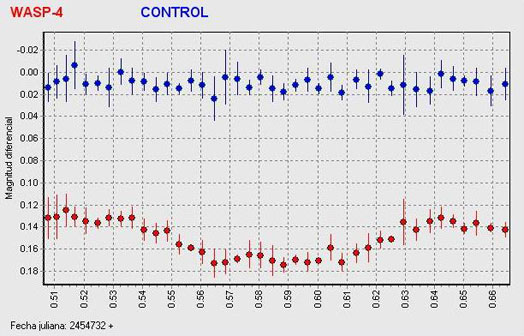 En el gráfico superior puede verse la curva de luz generada gracias a las observaciones fotométricas. Los puntos azules representan a la estrella de control, mientras que los rojos muestran el descenso de magnitud de la estrella causado por el tránsito de Wasp-4 delante de ella.