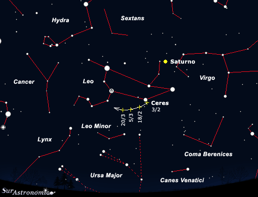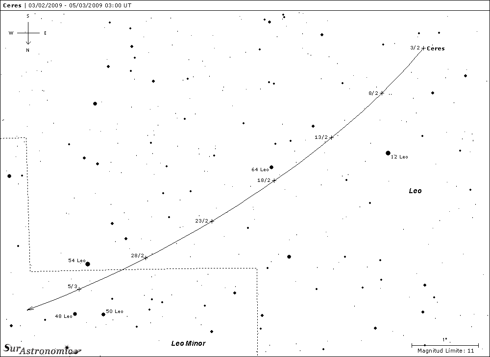 Ceres estará en oposición con el Sol el 25 de Febrero (13:43 UT) brillando en Leo con magnitud +6.9 y observable durante toda la noche. Su mayor acercamiento a la Tierra se dará algunas horas más tarde, a las 23:38 UT, cuando se encuentre a 1.5832 Unidades Astronómicas, la menor distancia desde el 14 de Febrero de 1857 (152 años atrás), y la menor hasta el 9 de Mayo de 4164.