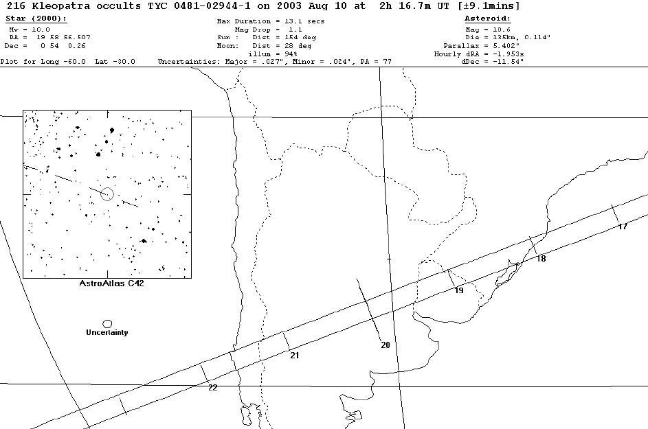 La ocultación se producirá el 10/08 a las 2h 16.7m UT (9/08 23:15 hora Argentina) La estrella (TYC-0481-02944-1) de magnitud 10.0 se localiza en las coordenadas (2000.0):