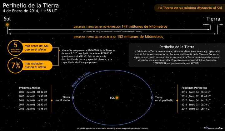 La órbita de la Tierra no es circular, sino una elipse, donde el Sol ocupa uno de los focos. En su recorrido anual la distancia entre la Tierra y el Sol cambia, llegando a su máximo acercamiento, denominado perihelio, el próximo 4 de Enero de 2014 a las 11:58 UT, cuando se localice a 147 millones de kilómetros del Sol, unos 5 millones de kilómetros mas cerca que en su punto mas lejano (el afelio). A pesar de estar a menor distancia y recibir un 7% mas de radiación desde el Sol, la temperatura promedio del planeta es de alrededor de 2.3ºC mas baja en el perihelio en comparación con la temperatura promedio en el afelio. Este efecto se debe a la distribución irregular de tierra y agua del planeta, y a la capacidad calorífica de cada uno.
