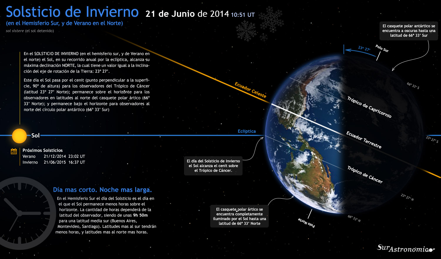 El 21 de Junio de 2014 a las 10:51 UT se produce el Solsticio de Invierno (o de Verano, para el hemisferio norte). En ese momento el Sol alcanzará su máxima declinación norte, la cual se corresponde con la inclinación del eje de rotación de la Tierra, unos 23.5º. A su vez el Sol pasará por el cenit sobre el Trópico de Cáncer, iluminará pro completo el casquete polar ártico y permanecerá a oscuras el casquete polar antártico. La máxima altura del Sol (al mediodía, cuando cruce el meridiano) será la mas baja del año, estando a unos 23.5º por debajo de la altura del ecuador celeste. El día del solsticio de invierno es el mas corto en el hemisferio sur, siendo de unas 9h 50m para latitudes intermedias como la de Buenos Aires, Montevideo y Santiago.