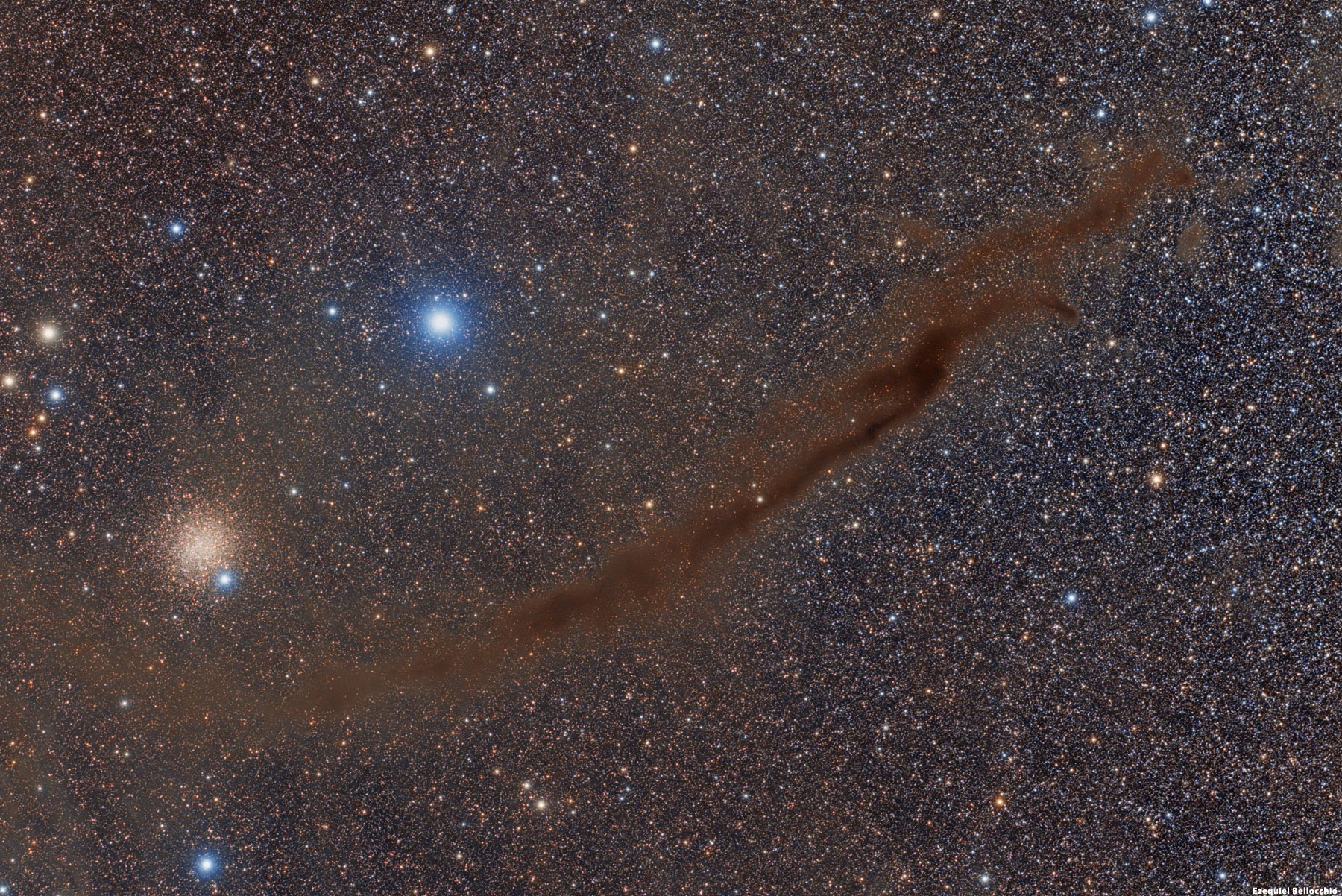 Las nebulosas oscuras o nebulosas de absorción son un tipo de nube interestelar suficientemente densa como para oscurecer la luz de los objetos que se encuentran por detrás de la nebulosa. Se componen de granos de polvo de un tamaño menor a 1 micrómetro, y se localizan en las regiones más densas y frías de las nubes moleculares. Muchas de ellas son observables desde cielos oscuros, así como también es posible fotografiarlas bloqueando la luz de las pobladas zonas estelares de la galaxia. Este es el caso de las dos imágenes que nos envía Ezequien Bellocchio, mostradas a continuación.