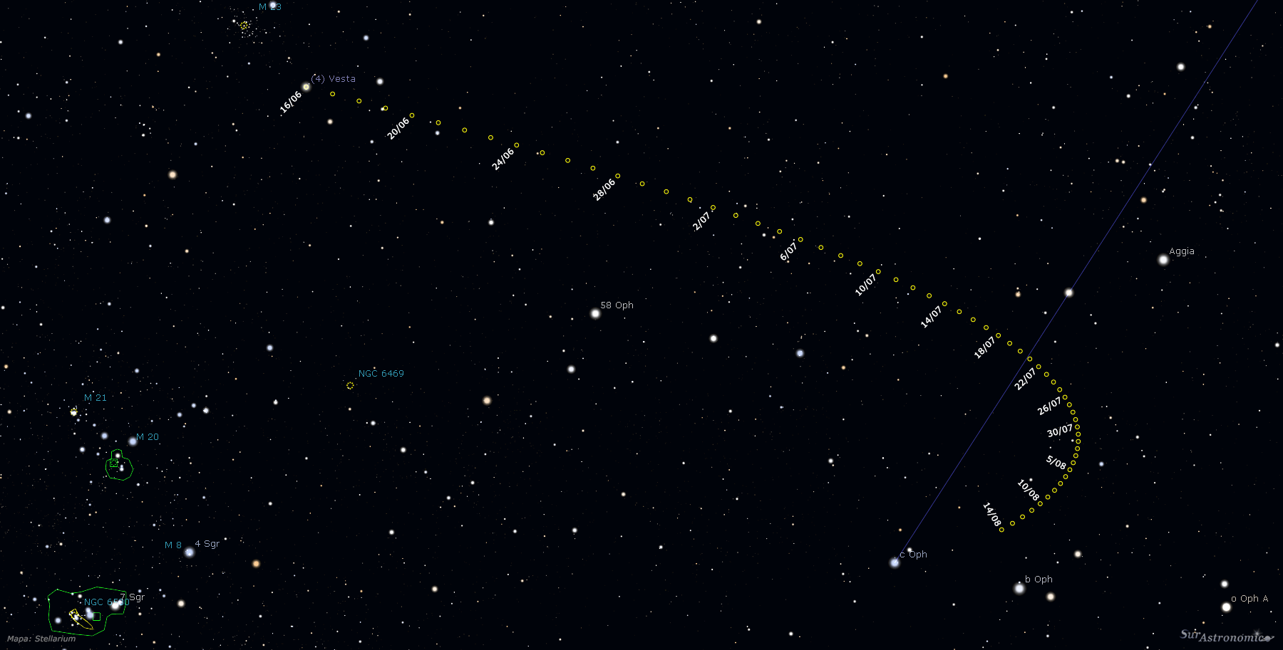 El asteroide (4) Vesta posee un diámetro de 530 km y un período orbital de 1325 días terrestres. El próximo 19 de junio (20:53 UT) estará en oposición con el Sol brillando con magnitud +5.3, pudiendo ser observado con instrumentos pequeños, o incluso a simple vista desde cielos razonablemente oscuros (desafiante desde cielos suburbanos, pero posible con paciencia). Estará moviéndose por la constelación de Sagittarius, pasando a 0.3º del cúmulos globular NGC 6440 el 22/06 y con la Luna a 3º el 26/06, para luego crzar a Ophiuchus el 28/06.