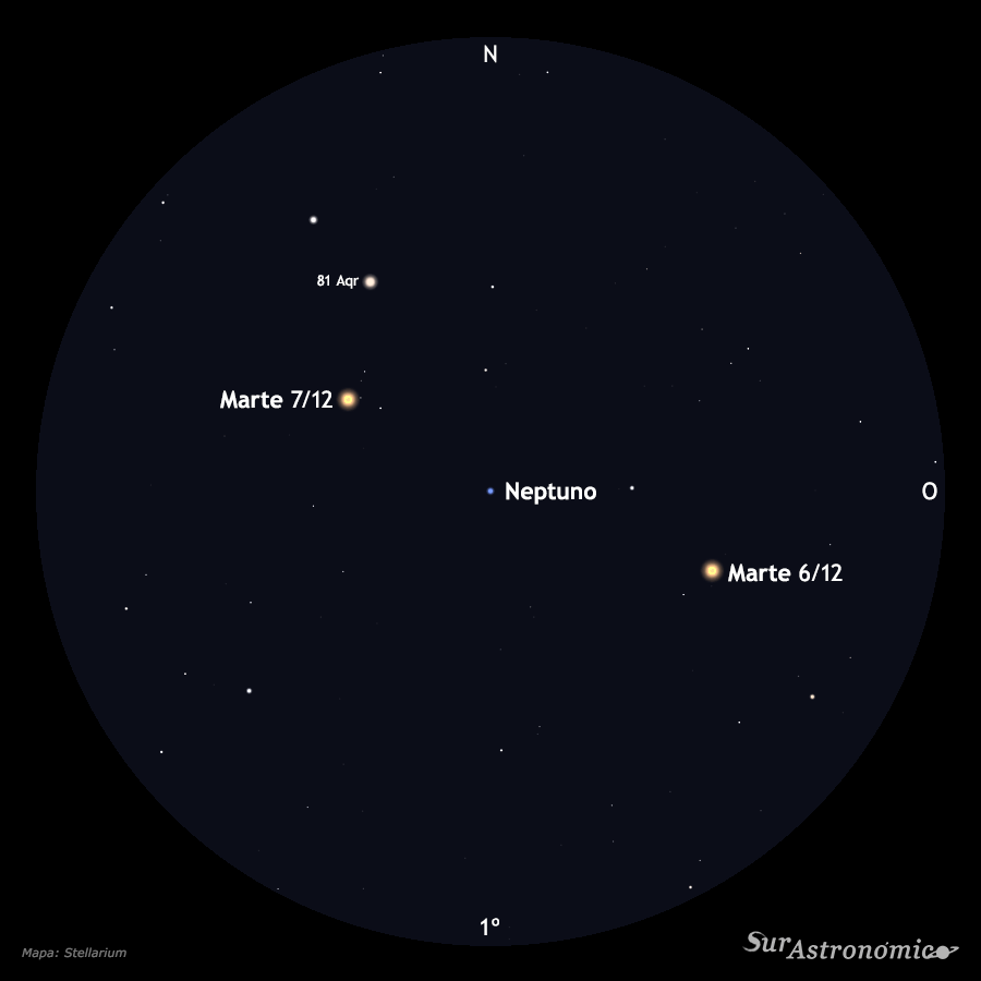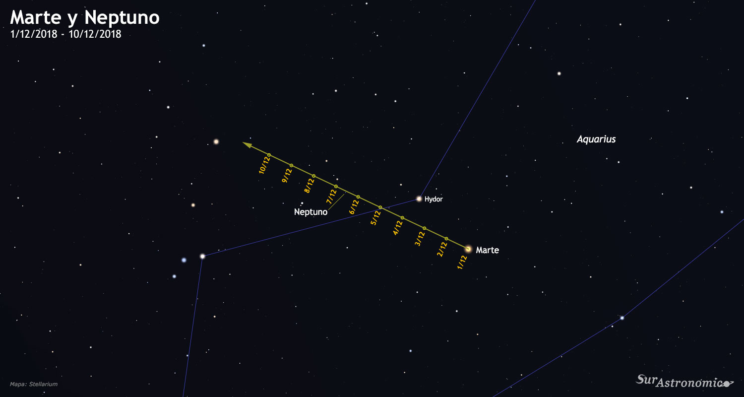 El planeta Marte, brillando con magnitud +0.2 (visible a simple vista) en la constelación de Aquarius, estará en conjunción con Neptuno el 6/12/2018 (21 minutos de arco) y el 07/12/2018 (18 minutos de arco). Neptuno, el planeta más lejano de nuestro Sistema Solar, estará brillando con magnitud +7.9, observable con telecopios pequeños, o con binoculares desde cielos oscuros. Presentará un tamaño aparente de 2.3 segundos de arco, un pequeño disco azulado visible con telescopio utilizando unos 100 aumentos.