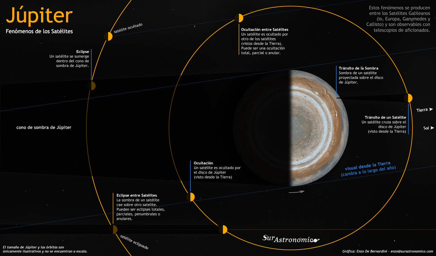 El siguiente gráfico ilustra las diferentes combinaciones de los fenémenos de los satélites, tanto con Júpiter como entre ellos mismos. Los tamaños y distancias no se encuentran a escala. Créditos del gráfico: Enzo De Bernardini.