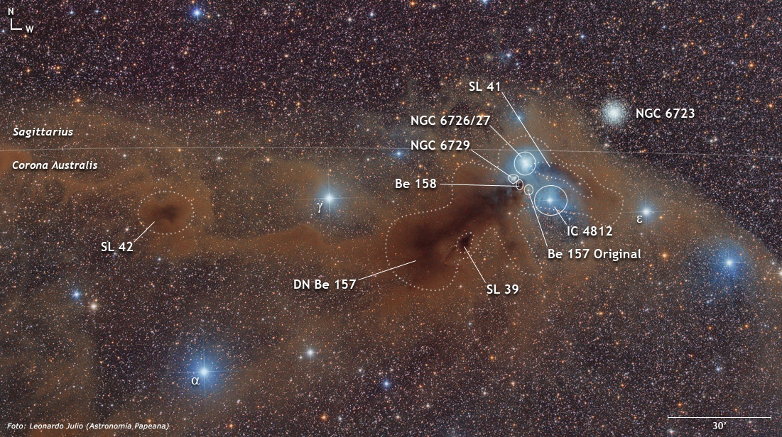 Como decíamos, esta gran zona oscura e irregular es la llamada inadecuadamente Be 157. Fue descubierta el 30 de julio de 1826 por James Dunlop (1793-1848), con un telescopio reflector con espejo metálico de Speculum de 9” (equivalente hoy en día a un reflector de aproximadamente 6”), desde Parramatta, New South Wales, Australia. Este gran astrónomo escocés ingresó el área en su catálogo con el número 559, y la describió como "Un singular espacio oscuro en el cielo, de forma irregular, de unos 1½° de longitud, y 1½° de ancho; sin estrellas, exceptuando unas excesivamente diminutas en la porción más grande de este espacio”. Localizada en (19h 02m 54s; -37º 08'_J2000.0), entre las estrellas amarillas gamma (γ) y epsilon (ε) CrA.