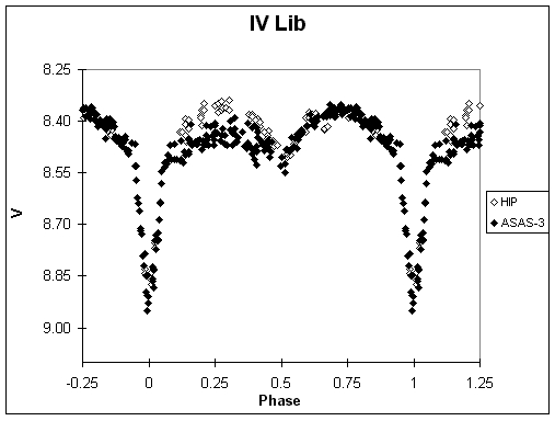 Es de notar que el período de NSV 233 es inusualmente largo para estrellas con efecto O'Connell. Los colores de NSV 233 demuestran que se trata de estrellas G ó K. Sin embargo hay otro caso similar con un período aún mayor: IV Librae un sistema de tipo espectral F0 y un período de 6,8617 d. Lo que hace a IV Lib aún más especial es que se trata de una de las pocas EA con efecto O'Connell. Su curva de luz se muestra en la figura 2 y en ella vemos que el efecto O'Connell es también variable y de forma más pronunciada aún que en nuestra variable del mes: entre las observaciones de Hipparcos y de ASAS, el signo del efecto ha cambiado de positivo a negativo!!!
