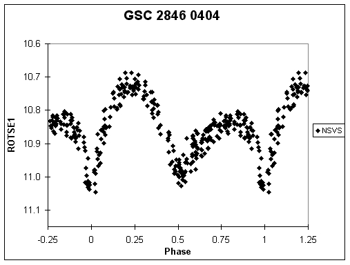 Por último, GSC 2846 0404, per. 0.387374 d., tipo espectral K0, es un ejemplo típico en cuanto a corto período y naturaleza EW, aunque extremadamente pronunciado. La figura 3 es elocuente.